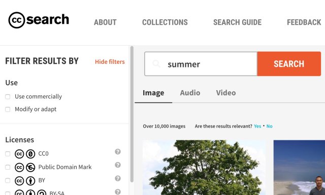 Anzeige der Suchergebnisse auf der CC Search mit der Möglichkeit, die Suche nach Creative Commons-Lizenzschlüssel weiter zu verfeinern