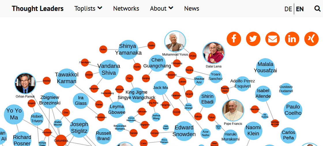 Das aktuelle NZZ-Folio hat in Zusammenarbeit mit dem Gottlieb Duttweiler-Institut und dem MIT-Forscher Peter Gloor eine Liste der wichtigsten Ideengeber unserer Zeit erstellt (S. 94-105 “Wegbereiter, Vordenker und Pioniere”). Die Liste ist online unter thoughtleaders.world abrufbar.