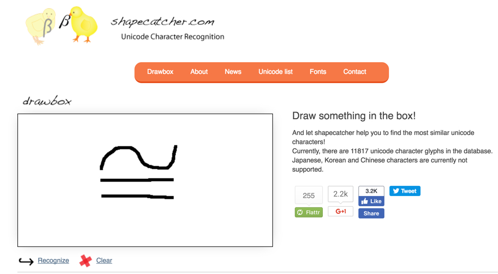 Searchresearch gibt im Blogpost “Answer: Finding interesting uses for emoji/Unicode search?” u.a. Hinweise, wie Sonderzeichen gesucht werden können. Das Tool Shapecatcher erlaubt es z.B., ein in einem mathematischen Buch gefundenes Zeichen mit der Maus zu zeichnen und dann zu suchen. Das Tool gibt einem die Bedeutung und den Hexadezimalcode an. Das obige Beispiel ergibt: